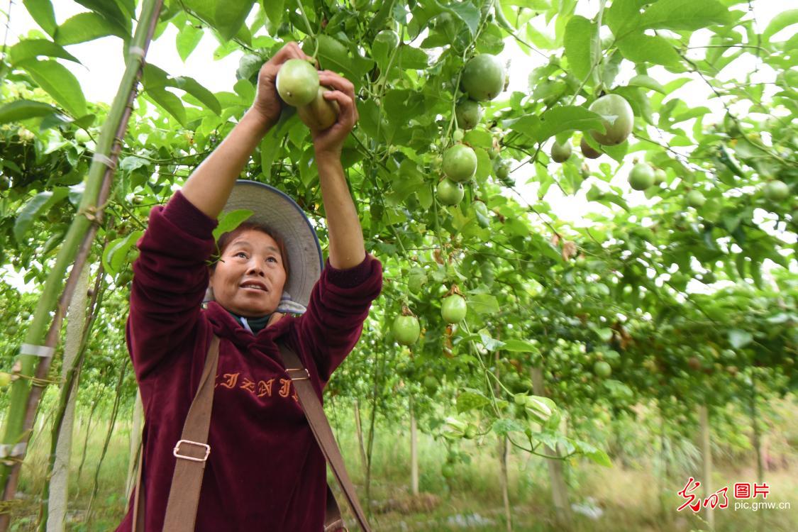 2020年10月9日,村民在贵州省锦屏县新化乡新化寨村的百香果种植基地采摘百香果。眼下,贵州省黔东南苗族侗族自治州锦屏县新化乡新化寨村的百香果种植基地迎来丰收季,当地村民忙着采摘、搬运百香果,供应各地市场。(杨晓海摄/光明图片)