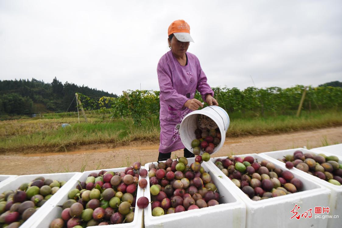 2020年10月9日,村民在贵州省锦屏县新化乡新化寨村的百香果种植基地收获百香果。眼下,贵州省黔东南苗族侗族自治州锦屏县新化乡新化寨村的百香果种植基地迎来丰收季,当地村民忙着采摘、搬运百香果,供应各地市场。(杨晓海摄/光明图片)