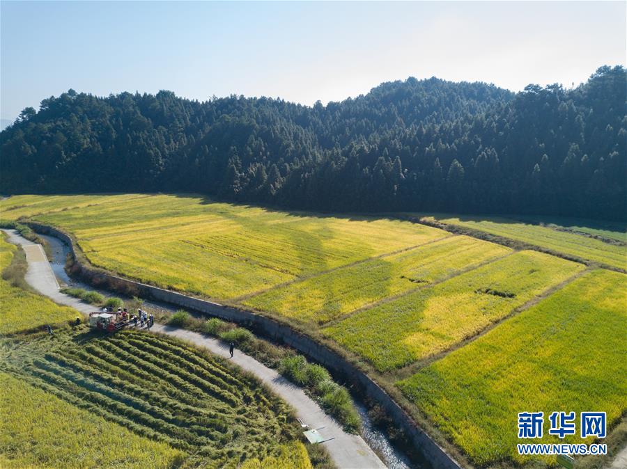 10月10日,在福建省南平市浦城县仙阳镇麒麟畈,收割机在收割常规稻“福香占”(无人机照片)。 近日,福建省南平市浦城县约48万亩水稻喜获丰收。近年来,该县持续打造现代绿色农业,让武夷山脉腹地出产的高品质大米飘香四海。 新华社记者 宋为伟 摄