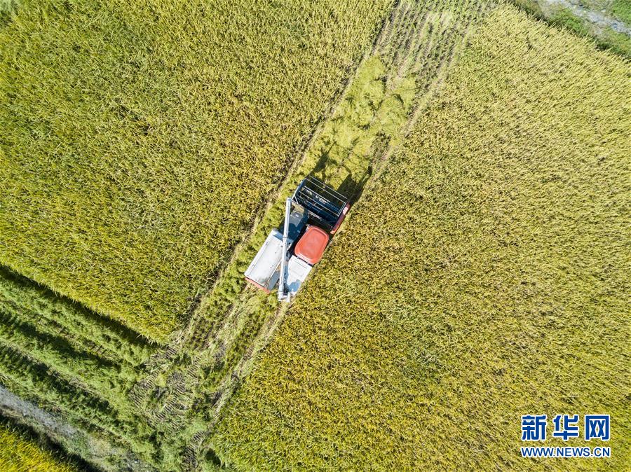 10月10日,在福建省南平市浦城县仙阳镇麒麟畈,收割机在收割常规稻“福香占”(无人机照片)。 近日,福建省南平市浦城县约48万亩水稻喜获丰收。近年来,该县持续打造现代绿色农业,让武夷山脉腹地出产的高品质大米飘香四海。 新华社记者 宋为伟 摄