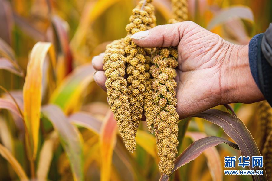 10月10日拍摄的河北省武安市永和村成熟的谷子。 近日,河北省中南部地区秋收秋种陆续展开,农民抢抓农时收获、耕种,田间地头呈现一片繁忙景象。 新华社记者 王晓 摄