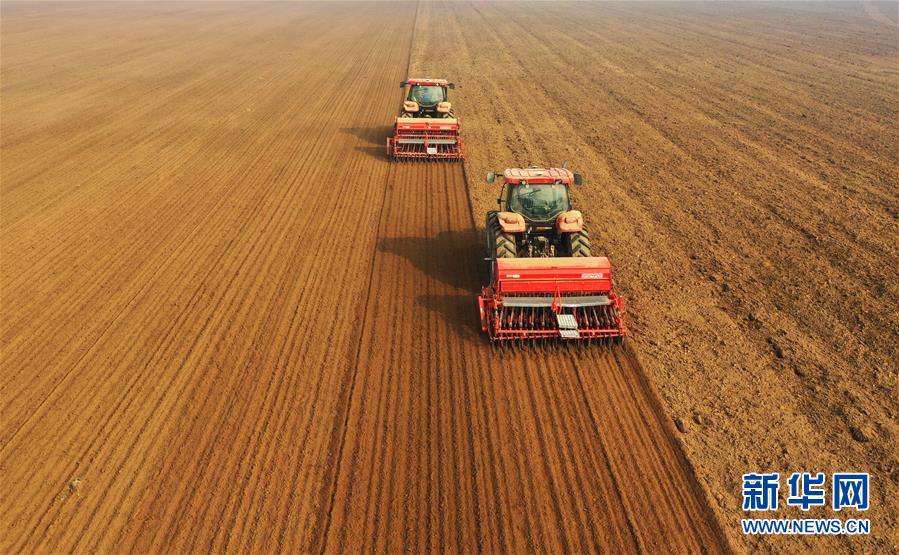 10月11日,河北省邢台市南和区闫里乡金沙河农作物种植专业合作社农民在田地播种冬小麦(无人机照片)。 金秋时节,河北省冀中南地区农民抢抓墒情有利时机播种冬小麦,田间一派忙碌景象。 新华社记者 朱旭东 摄