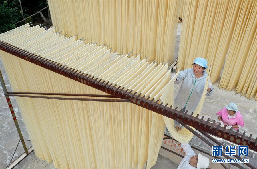 10月12日,威县梨园屯镇东赵村村民在挂面作坊晾晒手工挂面。 河北省邢台市威县梨园屯镇东赵村的手工空心挂面迄今已有上百年的加工历史。近年来,这个村采取“合作社+农户”的形式,把传统的手工挂面产业做大做强。目前全村相关从业人员达300余人,产品远销北京、天津、山东等地,年产值2000余万元,手工挂面生产已成为当地农民致富的重要途径。 新华社记者 朱旭东 摄