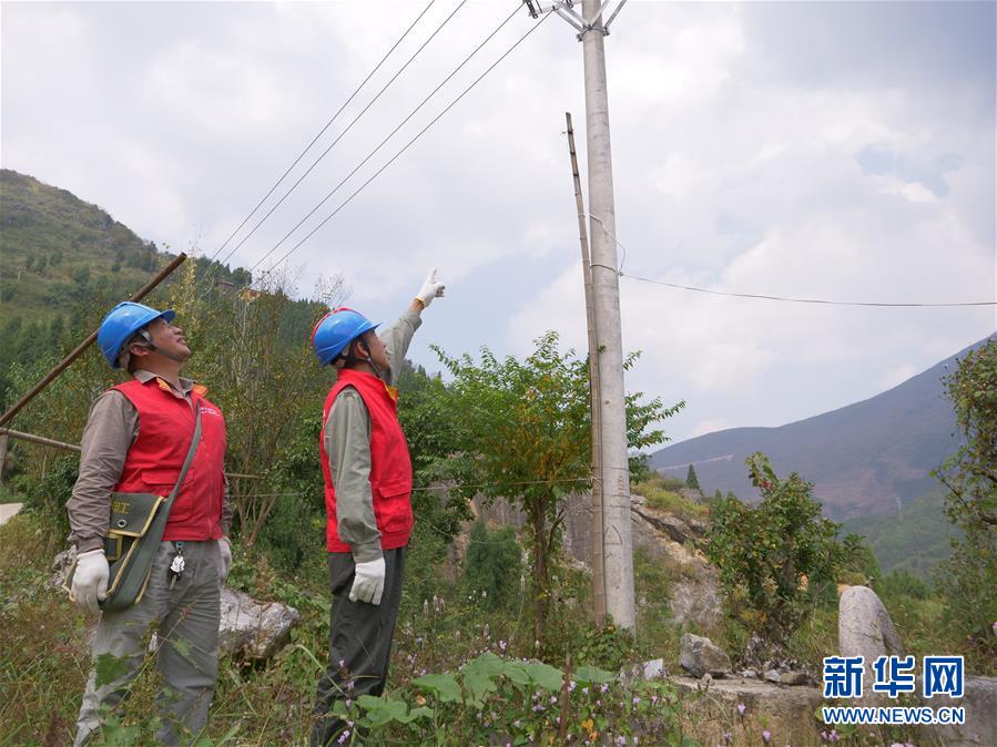 10月12日,湖北咸宁“跑山电工”党员服务队队员在“抢水崖”附近巡查线路。 新华社发(王栖雅 摄)
