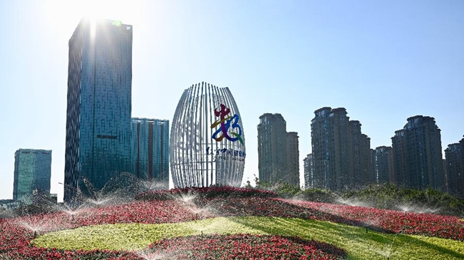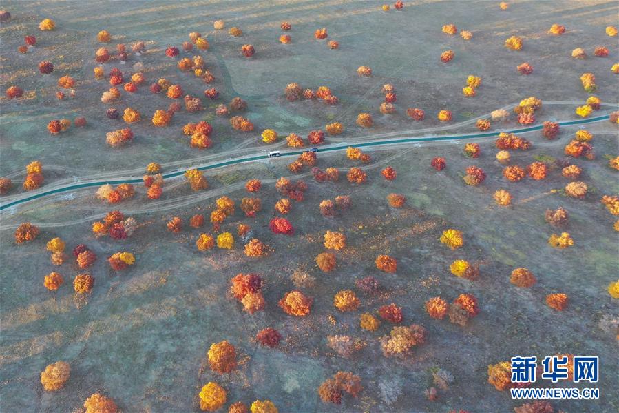 10月11日,观光车行驶在五角枫生态旅游景区内的道路上(无人机照片)。 金秋时节,内蒙古兴安盟科尔沁右翼中旗五角枫生态旅游景区的五角枫迎来最佳观赏期,棵棵枫树点缀了秋日草原,美景如画。 新华社记者 徐钦 摄