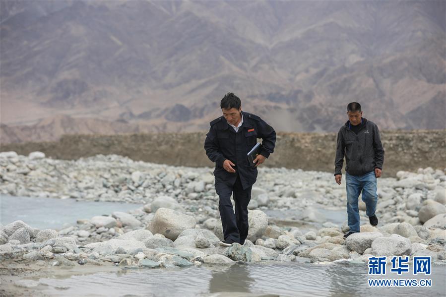 甘肃盐池湾国家级自然保护区管理局扎子沟保护站值班长哈斯巴特尔(左)和同事巡山(8月3日摄)。新华社记者 马希平 摄