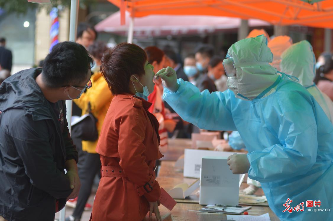 2020年10月12日,山东省青岛市一处社区,居民正在进行核酸检测。当日,青岛市召开新闻发布会,截至10月12日17时30分,未发现新的阳性感染者,已基本掌握青岛6例新增确诊病例和6例无症状感染者活动轨迹。(王海滨摄/光明图片)