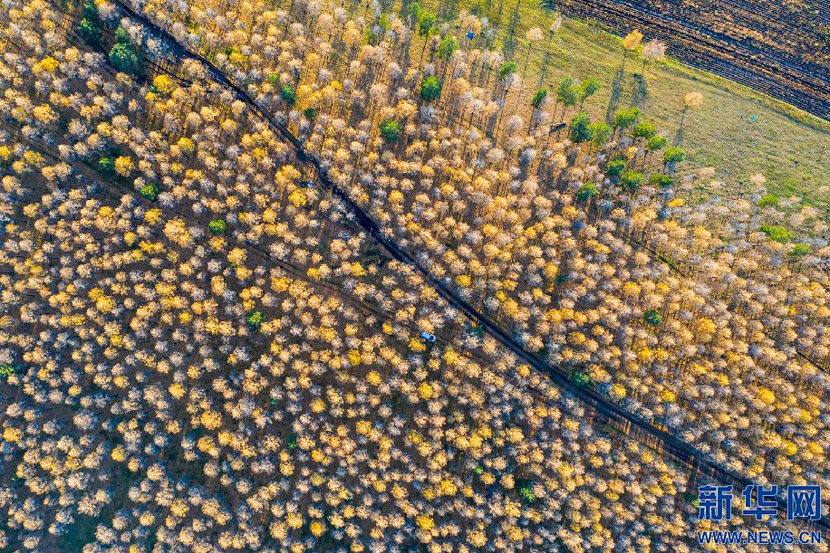 深秋时节,内蒙古大兴安岭上的兴安落叶松绽放出金黄的颜色,在阳光下绚烂夺目。新华网发(李明 摄)