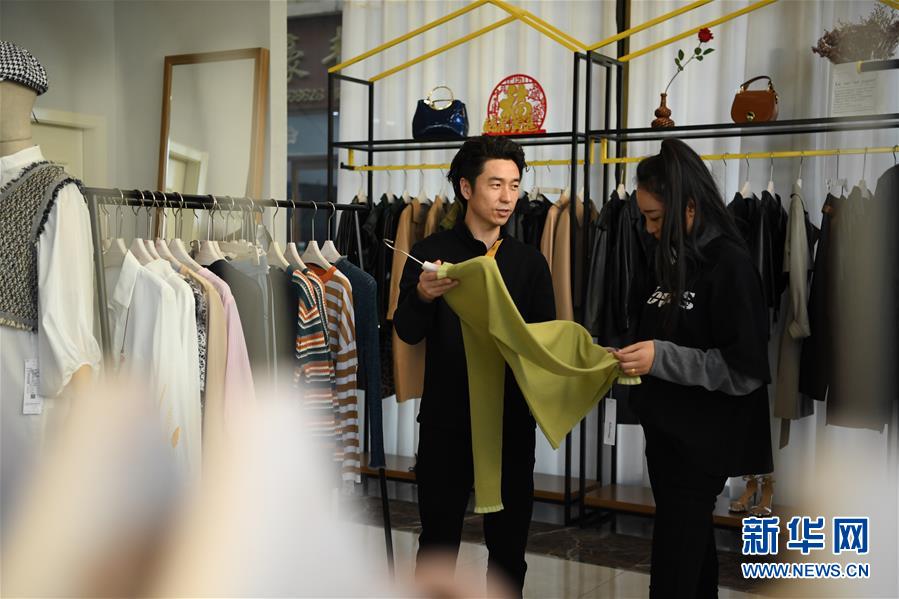 10月12日,河北廊坊云裳小镇精品服饰区商户黄鹏程(左)为顾客介绍服装。新华社记者 朱旭东 摄