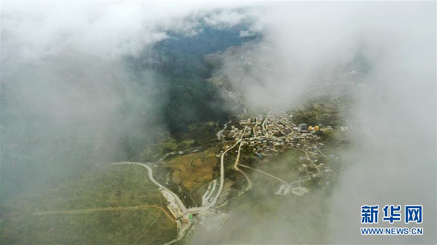雨后扎尕那,村庄在雾气中若隐若现(10月13日摄,无人机照片)。新华社记者 文静 摄