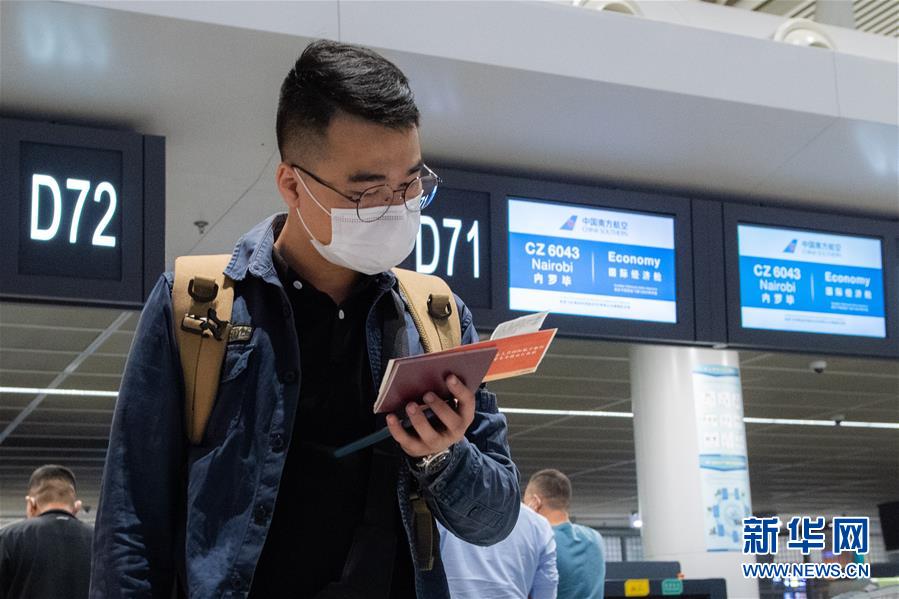 10月13日晚,在长沙黄花国际机场,乘坐CZ6043次航班的旅客在查看机票信息。 10月14日凌晨,由中国南方航空公司执飞的长沙—内罗毕航线复航。这是新冠肺炎疫情发生后湖南省恢复的首条定期洲际客运航线。 新华社记者 陈思汗 摄