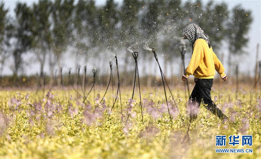 10月13日,在八角台街道雅化村,一处花圃进行灌溉。 辽宁省鞍山市台安县八角台街道是我国著名的宿根花卉产业基地,金秋时节,花农们在花圃内紧张忙碌。“十三五”以来,当地发展培育了福禄考、薰衣草、荷兰菊等一百多个花卉品种,年产值超5000万元。 新华社记者 姚剑锋 摄