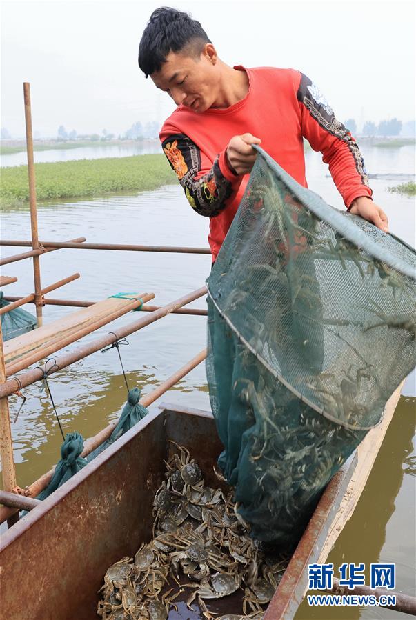 10月14日,唐山市丰南区柳树瞿阝镇的农民将捕捞的螃蟹倒入槽箱。 近年来,河北省唐山市丰南区大力发展“稻虾、稻蟹共作”立体生态循环农业,促进农民增收。据介绍,目前该区“稻虾、稻蟹共作”立体生态种养面积达3万亩,带动近2000户农民增收。 新华社记者 杨世尧 摄