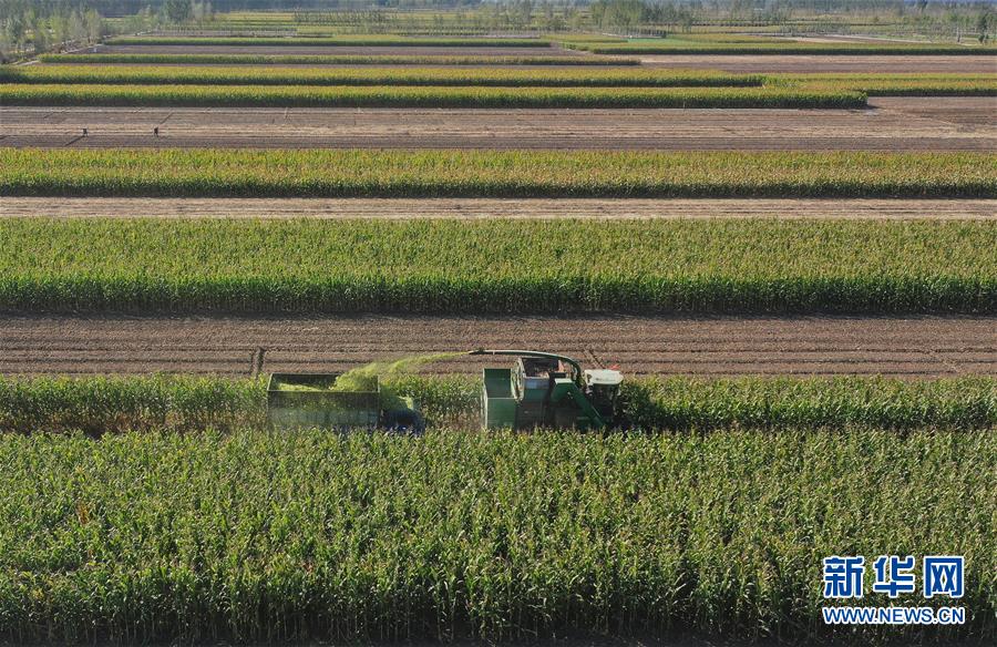 10月14日,唐山市丰润区李钊庄镇李虎庄村的农民驾驶收割机收获青贮玉米(无人机照片)。