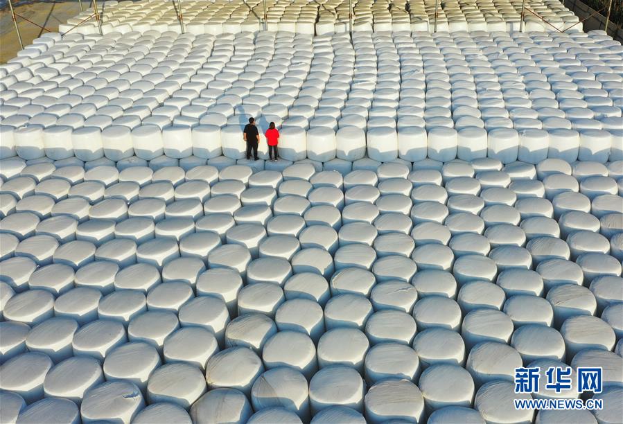10月14日,在唐山市丰润区丰登坞镇大郑庄村一青贮玉米收购点,工人在清点裹包好的青贮玉米(无人机照片)。新华社记者 杨世尧 摄