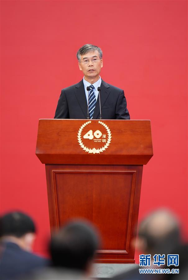 10月14日,深圳经济特区建立40周年庆祝大会在广东省深圳市隆重举行。这是中建科工集团有限公司华南大区总工程师陆建新在庆祝大会上发言。 新华社记者 张领 摄