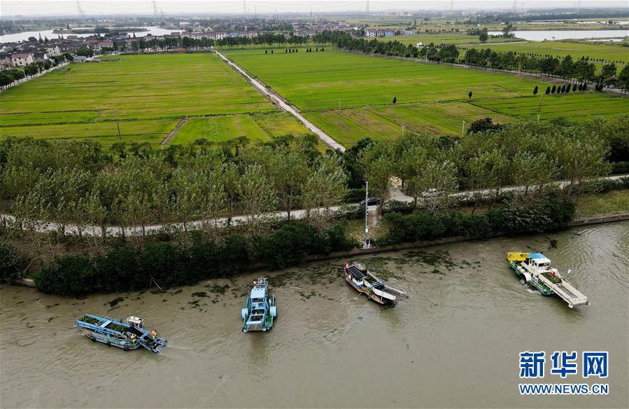 10月15日,苏浙沪三地的保洁船在太浦河水域联合清理水面浮游植物(无人机照片)。 当日,来自苏州市吴江区、上海市青浦区和嘉兴市嘉善县的三位河长在位于长三角生态绿色一体化发展示范区的苏浙沪交界水域太浦河流域附近开展联合巡河活动。自2019年10月开始,地处长三角生态绿色一体化发展示范区的青浦、吴江和嘉善实行“联合河长制”,协同治理示范区河湖水系,为重点跨界水体的联保工作提供强有力的支撑。 新华社记者 方喆 摄