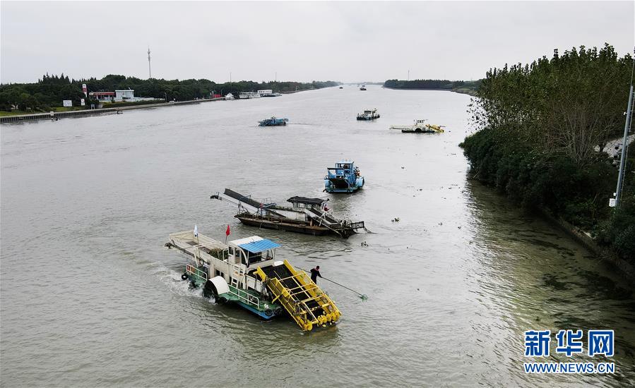10月15日,苏浙沪三地的保洁船在太浦河水域联合清理水面浮游植物(无人机照片)。 当日,来自苏州市吴江区、上海市青浦区和嘉兴市嘉善县的三位河长在位于长三角生态绿色一体化发展示范区的苏浙沪交界水域太浦河流域附近开展联合巡河活动。自2019年10月开始,地处长三角生态绿色一体化发展示范区的青浦、吴江和嘉善实行“联合河长制”,协同治理示范区河湖水系,为重点跨界水体的联保工作提供强有力的支撑。 新华社记者 方喆 摄