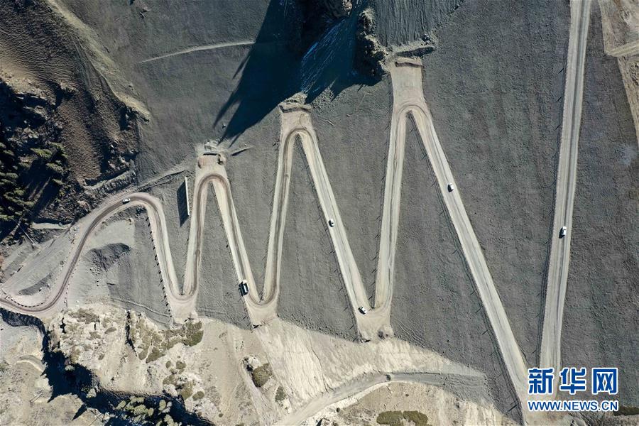 这是10月15日在新疆阜康抽水蓄能电站建设现场拍摄的“之”字形上坝道路(无人机照片)。新华社记者 丁磊 摄