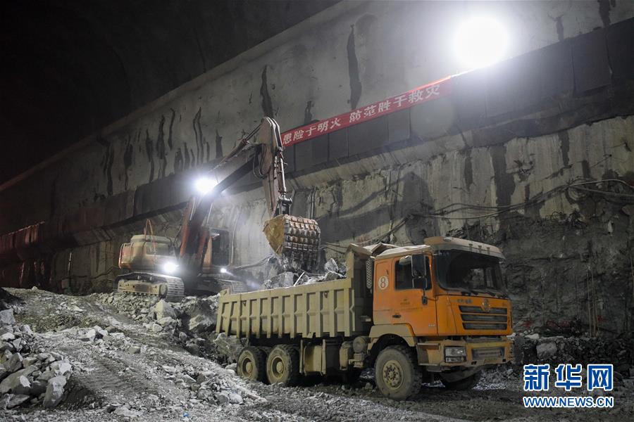 10月15日,挖掘机和运输车在新疆阜康抽水蓄能电站建设现场的地下厂房内进行出渣作业。新华社记者 丁磊 摄