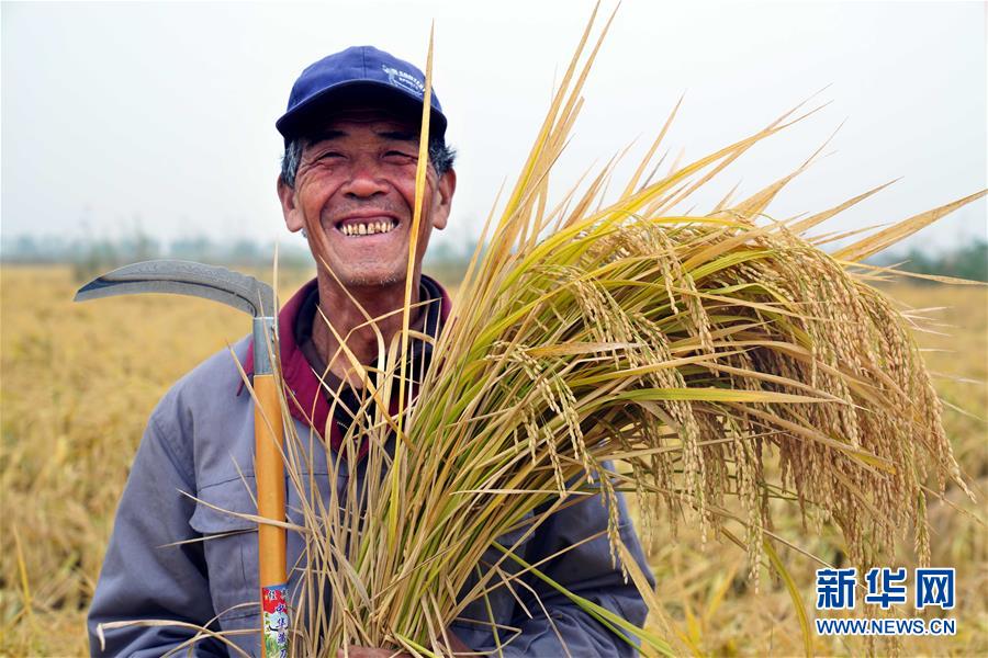 10月16日,在潍坊市寒亭区海水稻三产融合示范基地,一名农民展示刚收割的测产水稻。 当日,由袁隆平青岛海水稻科研团队研发的耐盐碱水稻(海水稻)在山东省潍坊市寒亭区海水稻三产融合示范基地完成产量测评,该基地5万亩海水稻平均亩产625.3公斤。 新华社记者 郭绪雷 摄