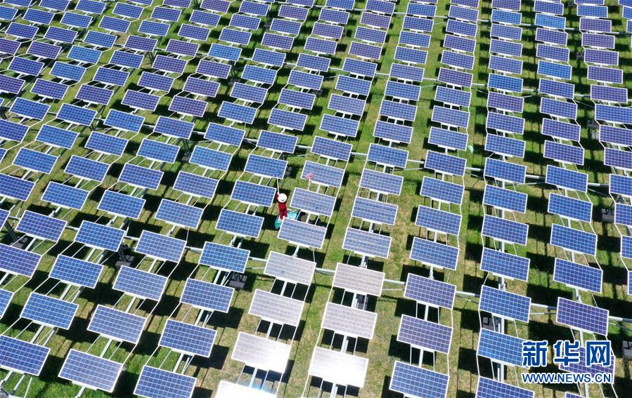 德胜村村民在村内的光伏电站清理发电板(6月23日摄,无人机照片)。 新华社记者 牟宇 摄