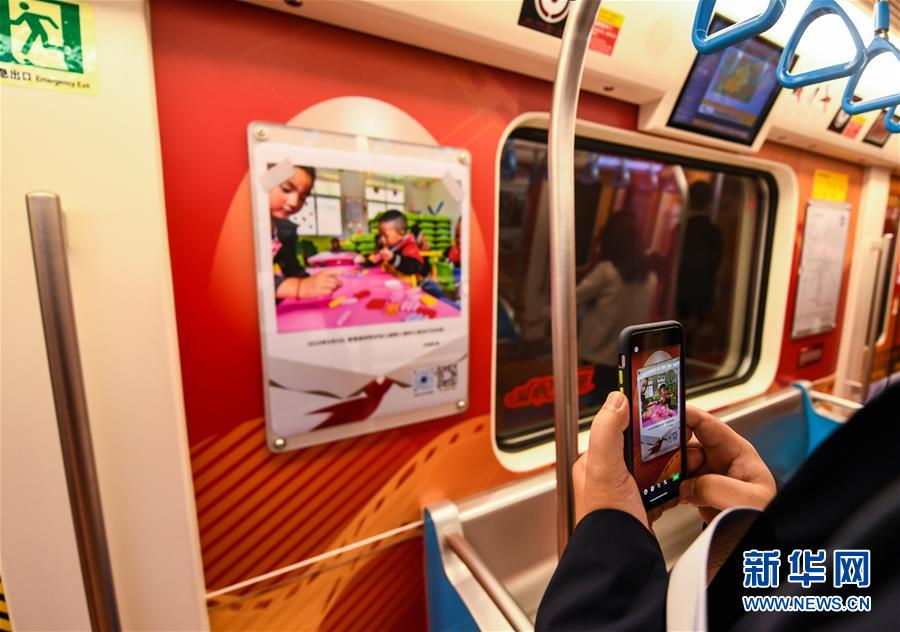 10月17日,在成都地铁1号线,一名乘客用手机拍摄车厢内展览的摄影作品。 新华社记者 王曦 摄