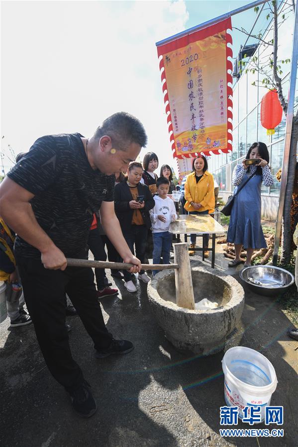 10月17日,墅丰村的庆丰收活动现场进行传统打年糕展示。新华社记者 徐昱 摄