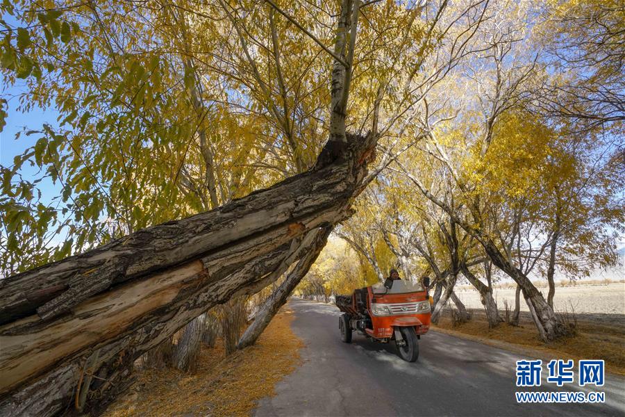 10月16日,在新疆塔什库尔干塔吉克自治县塔合曼乡,村民驾驶三轮车行驶在乡间道路上。 金秋十月,位于帕米尔高原的新疆塔什库尔干塔吉克自治县秋意正浓,蓝天、雪山和金黄色的胡杨把帕米尔高原描绘成一幅美丽画卷,吸引游客前来领略高原秋意。 新华社记者 赵戈 摄