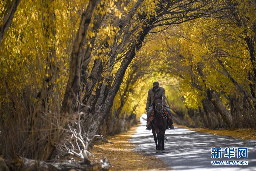10月16日,在新疆塔什库尔干塔吉克自治县塔合曼乡,当地村民骑马走在一条乡间道路上。 金秋十月,位于帕米尔高原的新疆塔什库尔干塔吉克自治县秋意正浓,蓝天、雪山和金黄色的胡杨把帕米尔高原描绘成一幅美丽画卷,吸引游客前来领略高原秋意。 新华社记者 赵戈 摄
