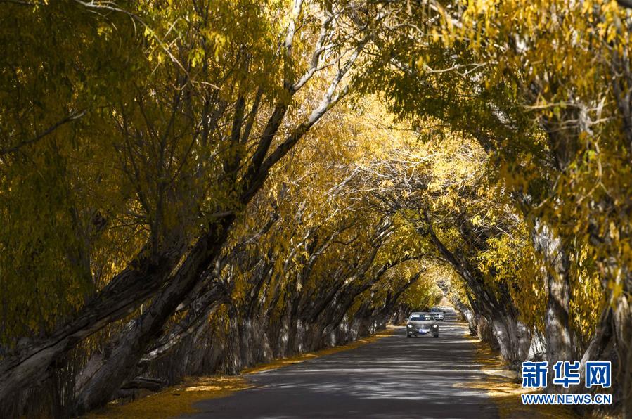 10月16日,在新疆塔什库尔干塔吉克自治县塔合曼乡,汽车行驶在乡间道路上。 金秋十月,位于帕米尔高原的新疆塔什库尔干塔吉克自治县秋意正浓,蓝天、雪山和金黄色的胡杨把帕米尔高原描绘成一幅美丽画卷,吸引游客前来领略高原秋意。 新华社记者 赵戈 摄