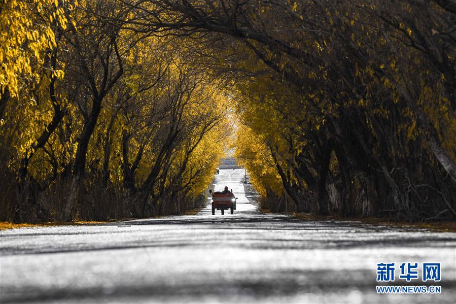 10月16日,在新疆塔什库尔干塔吉克自治县塔合曼乡,村民驾驶三轮车行驶在乡间道路上。 金秋十月,位于帕米尔高原的新疆塔什库尔干塔吉克自治县秋意正浓,蓝天、雪山和金黄色的胡杨把帕米尔高原描绘成一幅美丽画卷,吸引游客前来领略高原秋意。 新华社记者 赵戈 摄