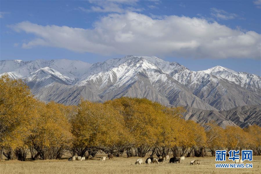 10月16日,在新疆塔什库尔干塔吉克自治县塔合曼乡,牛羊在草地上吃草。 金秋十月,位于帕米尔高原的新疆塔什库尔干塔吉克自治县秋意正浓,蓝天、雪山和金黄色的胡杨把帕米尔高原描绘成一幅美丽画卷,吸引游客前来领略高原秋意。 新华社记者 赵戈 摄