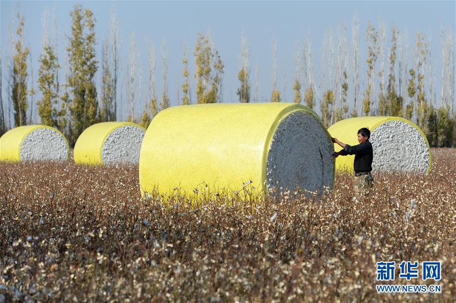 10月17日,在新疆玛纳斯县乐土驿镇文家庄村,棉农在查看采棉机自动打包好的棉花包。 金秋十月,新疆各地的棉花进入大规模采摘期。在新疆昌吉回族自治州玛纳斯县,83万亩棉花喜获丰收,棉农忙着采收棉花,轧花厂内车来车往,一派繁忙的景象。 近年来,玛纳斯县大力推广机采棉种植,并通过增加农机购置补贴等惠民政策,鼓励有条件的农机合作社、种棉大户购买大型采棉机,助力棉花产业高质量发展。目前,全县共有采棉机221台,预计棉花采收工作10月底可全部结束。 新华社记者 丁磊 摄