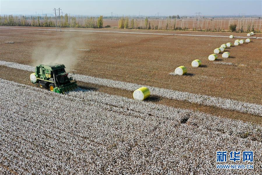 10月17日,在新疆玛纳斯县乐土驿镇文家庄村,采棉机在棉田里采收棉花(无人机照片)。 金秋十月,新疆各地的棉花进入大规模采摘期。在新疆昌吉回族自治州玛纳斯县,83万亩棉花喜获丰收,棉农忙着采收棉花,轧花厂内车来车往,一派繁忙的景象。 近年来,玛纳斯县大力推广机采棉种植,并通过增加农机购置补贴等惠民政策,鼓励有条件的农机合作社、种棉大户购买大型采棉机,助力棉花产业高质量发展。目前,全县共有采棉机221台,预计棉花采收工作10月底可全部结束。 新华社记者 丁磊 摄
