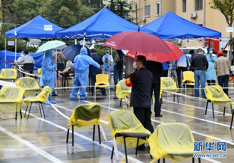 市民在青岛市市北区海伦路街道一检测点进行核酸检测采样(10月14日摄)。该检测点将延期2天继续进行免费核酸检测。 记者从青岛市政府新闻办17日下午召开的新闻发布会上获悉,青岛市保留了部分采样点,延期2天继续进行免费核酸检测。 新华社记者 李紫恒 摄