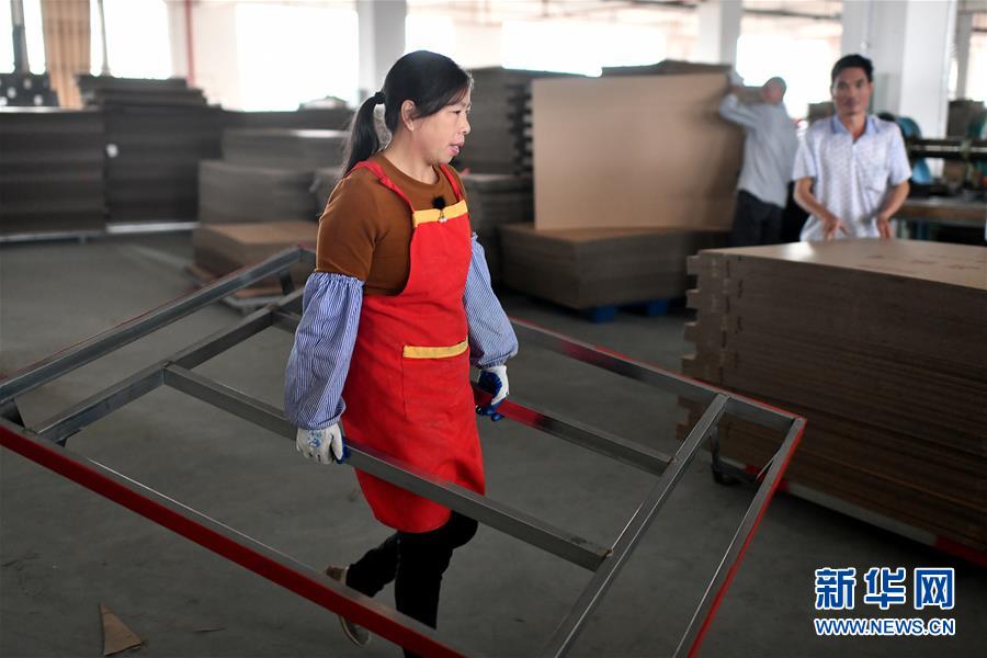 10月17日,曾被列为建档立卡贫困户的村民刘洪青在赣州市精印纸品包装有限公司的扶贫车间内搬运生产工具。 近年来,江西省赣州市因地制宜、因村施策,通过引导社会力量参与创办扶贫车间,鼓励服装纺织、家具制造等劳动密集型企业创办扶贫车间,帮助有就业能力和就业意愿,但家有老人和小孩无法外出就业的劳动力,实现家门口就业。截至今年8月,全市共有扶贫车间1100余家,吸纳贫困人口务工数超一万余人。 新华社记者 李鑫 摄