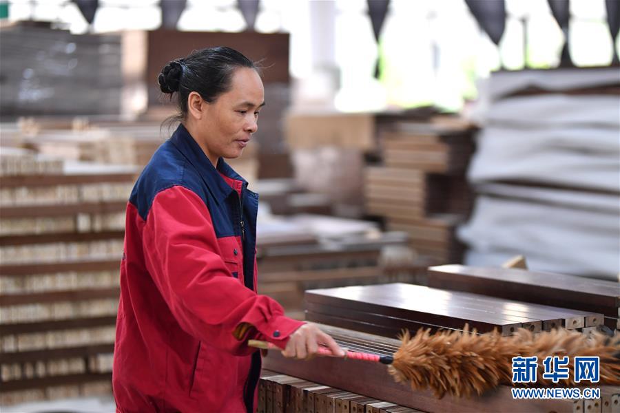 10月17日,曾被列为建档立卡贫困户的村民谢桂香在江西团团圆家具有限公司扶贫车间内清理木料。 近年来,江西省赣州市因地制宜、因村施策,通过引导社会力量参与创办扶贫车间,鼓励服装纺织、家具制造等劳动密集型企业创办扶贫车间,帮助有就业能力和就业意愿,但家有老人和小孩无法外出就业的劳动力,实现家门口就业。截至今年8月,全市共有扶贫车间1100余家,吸纳贫困人口务工数超一万余人。 新华社记者 李鑫 摄