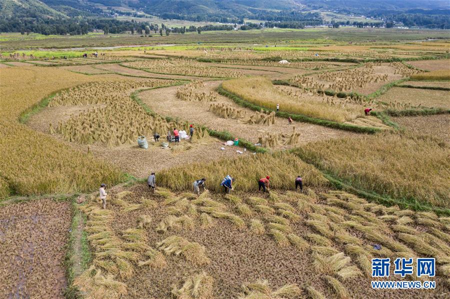 昭觉县地莫乡地莫村的群众在收割水稻(10月10日摄,无人机照片)。 位于四川省大凉山腹地的四川省昭觉县,是全国最大的彝族聚居县,也是四川省深度贫困县中贫困人口最多的县。经过近几年的努力,脱贫攻坚取得明显阶段性成效,彝区面貌发生历史性巨变。截至2019年底,全县实现136个贫困村退出,15506户70434名贫困人口减贫。 新华社记者张笑宇摄
