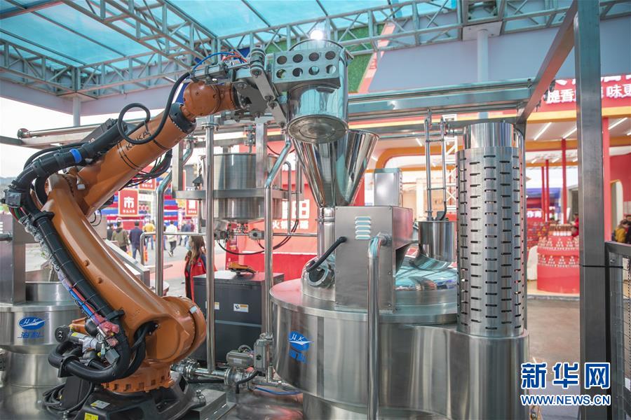 10月17日,在重庆国际博览中心火锅美食文化节现场,一台机器人炒料机在演示如何进行自主炒料。 日前,第十二届中国(重庆)火锅美食文化节暨国际食材博览会在重庆国际博览中心开幕。本届火锅节由往年的“一节”升级为“一会一节”,扩大火锅产业的交流、对话、交易平台。在为期3天的时间里,活动将给食客带来一场麻辣狂欢盛宴。 新华社记者 黄伟 摄