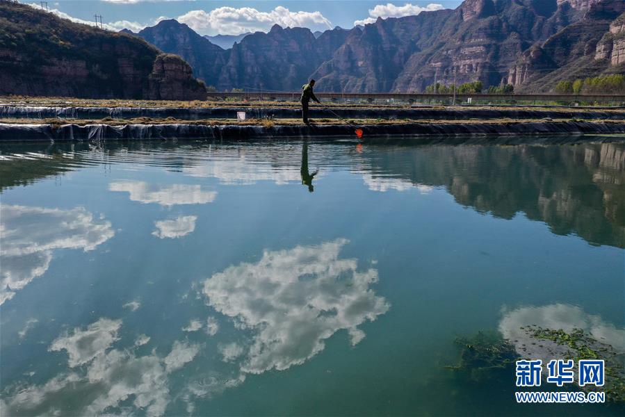 10月16日,山西省左权县麻田村的脱贫户在螃蟹养殖基地内捕捞螃蟹(无人机照片)。新华社记者 曹阳 摄