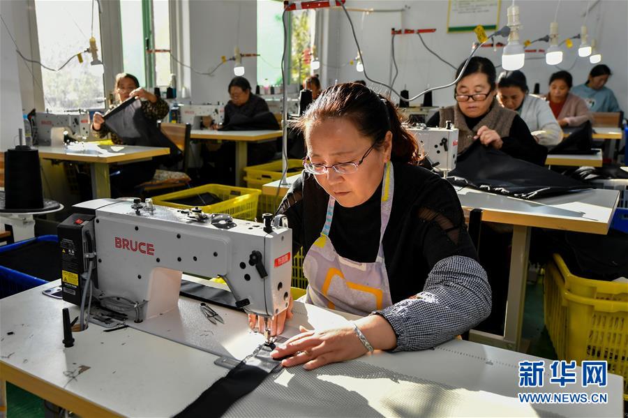 山西省左权县麻田村的脱贫户在服装加工厂内工作(10月16日摄)。新华社记者 曹阳 摄