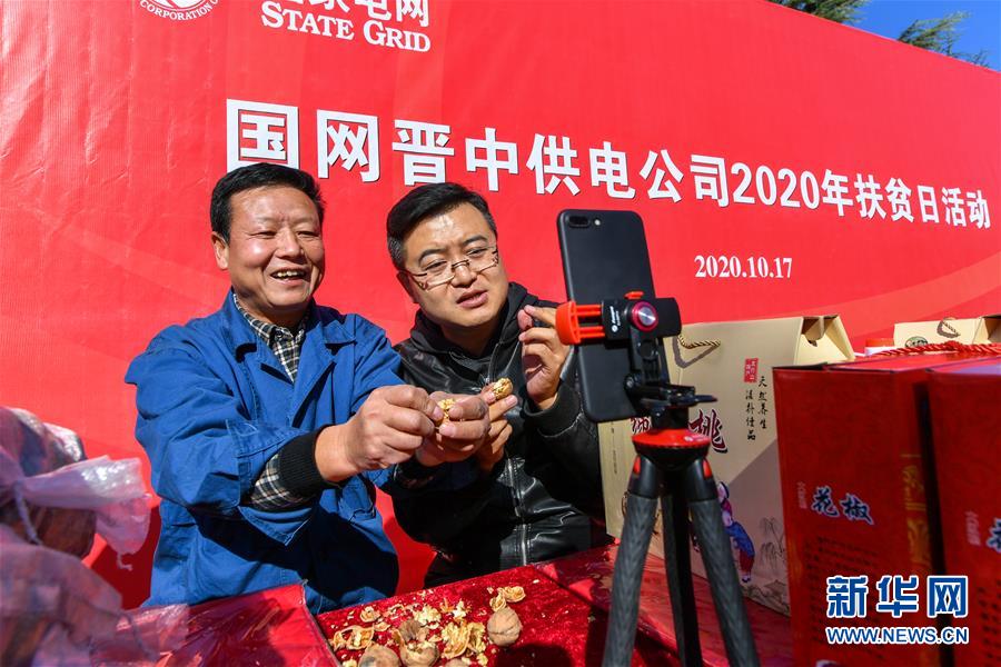 10月17日,山西省左权县麻田村的第一书记王玉恩(左)在农产品展销活动中为村里的土特产做宣传。新华社记者 曹阳 摄