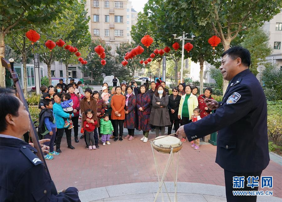 10月17日,在迁安市晨曦家园社区,民警胡建峰(右)和同事胡智均以乐亭大鼓表演形式向群众宣传防电信诈骗知识。 近日,河北省迁安市公安局的民警利用业余时间自编、自导、自演文艺节目进社区,通过情景再现等形式,将诈骗常见伎俩、防范举措演给群众看,增强居民的防诈骗意识。 新华社记者 杨世尧 摄