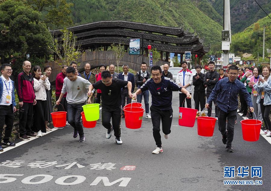 10月17日,景宁畲族自治县秋炉乡秋炉村,村民参与金秋送水农活竞技比赛。 当日,一场趣味运动会在浙江省丽水市景宁畲族自治县秋炉乡秋炉村举行。来自浙江景宁、庆元和福建寿宁三县十个乡镇的村民,通过参加趣味运动、农活竞技等活动,分享丰收的喜悦。 新华社发(李肃人 摄)