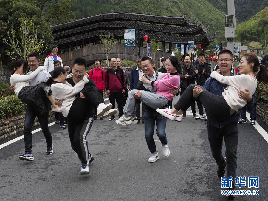 10月17日,景宁畲族自治县秋炉乡秋炉村,村民参加“抱媳妇”趣味运动。 当日,一场趣味运动会在浙江省丽水市景宁畲族自治县秋炉乡秋炉村举行。来自浙江景宁、庆元和福建寿宁三县十个乡镇的村民,通过参加趣味运动、农活竞技等活动,分享丰收的喜悦。 新华社发(李肃人 摄)