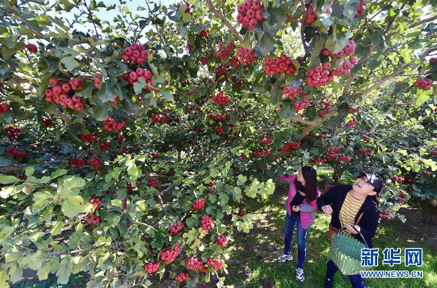 10月17日,在石家庄晋州市马于镇西贾庄村的山楂种植基地,游客在采摘山楂。 日前,河北石家庄晋州市马于镇西贾庄村的2800多亩山楂进入成熟期,农民抢抓农时收获山楂。西贾庄村采用“合作社+基地+农户”的模式,为农民提供技术服务和信息支持,拓宽销售渠道。山楂种植已经成为当地农民致富增收的支柱产业。 新华社发(张晓峰 摄)