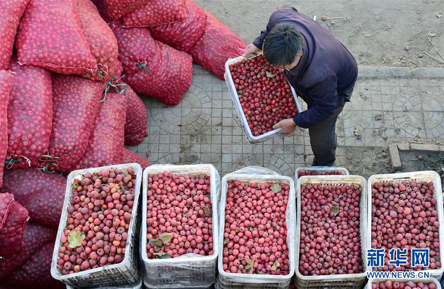10月17日,在石家庄晋州市马于镇西贾庄村,外地客商收购山楂。 日前,河北石家庄晋州市马于镇西贾庄村的2800多亩山楂进入成熟期,农民抢抓农时收获山楂。西贾庄村采用“合作社+基地+农户”的模式,为农民提供技术服务和信息支持,拓宽销售渠道。山楂种植已经成为当地农民致富增收的支柱产业。 新华社发(张晓峰 摄)