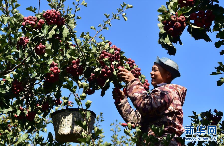 10月17日,在石家庄晋州市马于镇西贾庄村的山楂种植基地,农户收获山楂。 日前,河北石家庄晋州市马于镇西贾庄村的2800多亩山楂进入成熟期,农民抢抓农时收获山楂。西贾庄村采用“合作社+基地+农户”的模式,为农民提供技术服务和信息支持,拓宽销售渠道。山楂种植已经成为当地农民致富增收的支柱产业。 新华社发(张晓峰 摄)