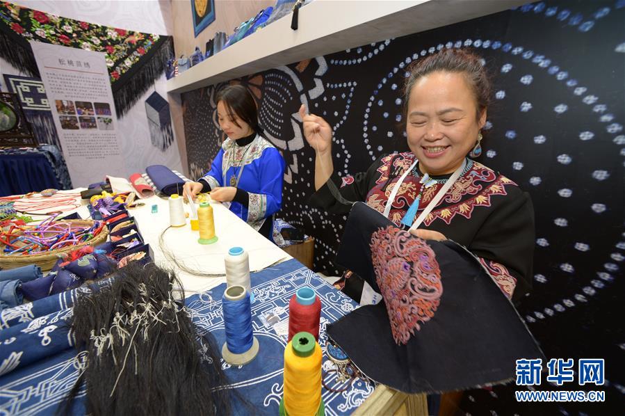 10月17日,在贵州省丹寨县万达小镇非遗展示馆,非遗传承人在展示“水族马尾绣”技艺。 当日,在贵州省黔东南苗族侗族自治州丹寨县万达小镇举行的中国丹寨非遗周上,来自贵州省内众多非遗传承人集中展示非遗技艺和展品。据了解,本次非遗周活动将持续至10月25日。 新华社记者 杨楹 摄